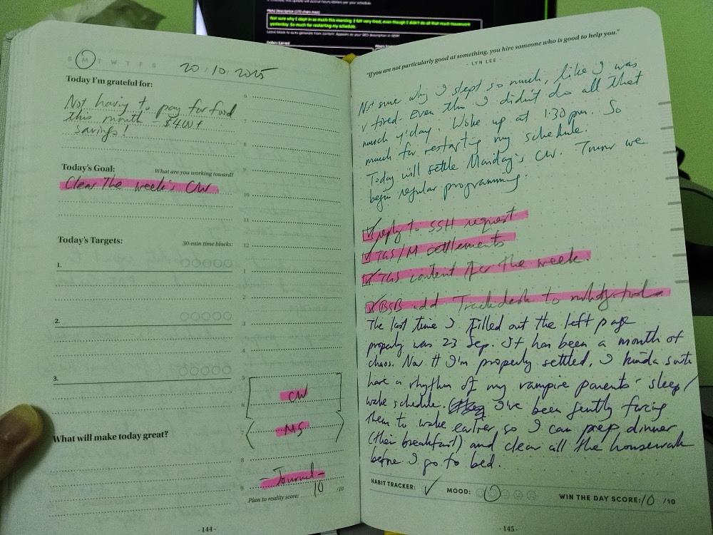 The last time I filled out the left side of my notebook was 23 Sep. It has been a month of chaos.