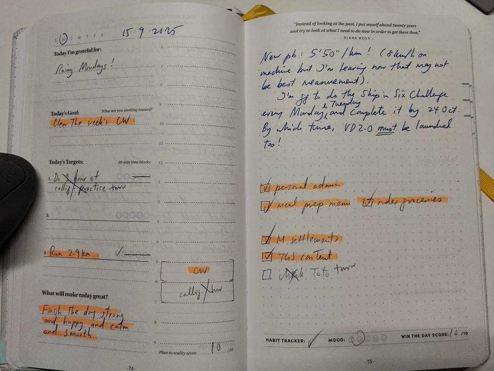 New running personal best: 5'50"/km! (8.0km/h on the machine but I'm learning now that may not be the best measurement). I'm going to make sure I do 6 consecutive days of exercise this week as well. It feels great, and I can already see the changes in my body.