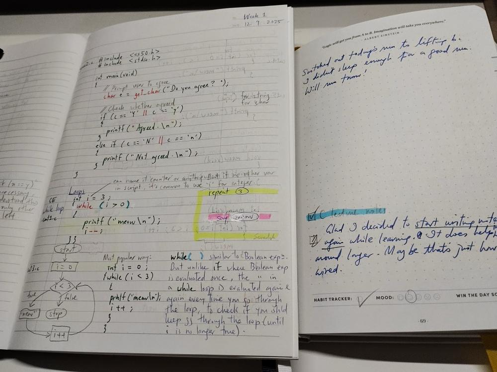 Glad I decided to start handwriting notes again while learning CS50. It does help info stick around longer in this Swiss cheese brain of mine. It also gives me a kind of meditative calm. Or maybe I just like the feeling of scratching ink on paper.