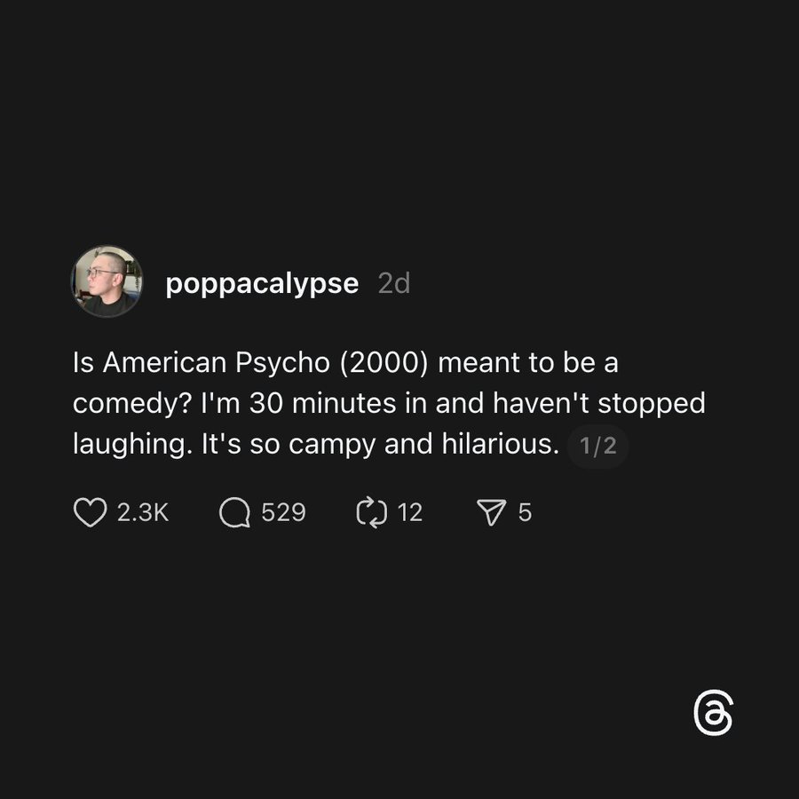 "Is American Psycho meant to be a comedy? I'm 30 minutes in and haven't stopped laughing. It's so campy and hilarious." I asked this same question on 4 different...