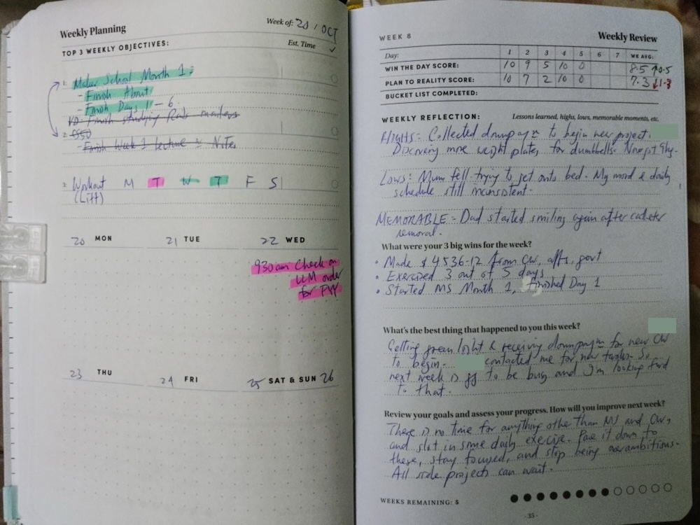 Weekly reflection • HIGHS: All clients paid up. Got exciting new project in hand. Discovered more weight plates for dumbbells, now got 2 x 9kg. • LOWS: Mum fell...